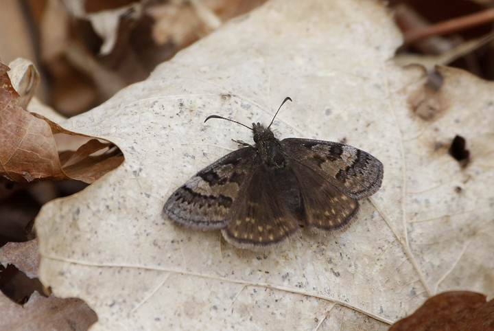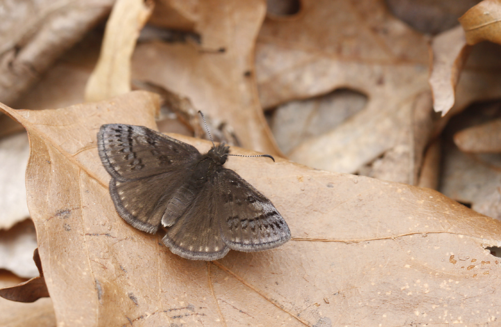 Below two: Two Dreamy/Sleepy Duskywings in Allegany Co., Maryland (4/19/2008). This is one of the tougher butterfly IDs. The lack of glassy white forewing spots rules out Juvenal's, Horace's, and Wild Indigo, but separating Dreamy and Sleepy is a real challenge. The verdict is that the first individual is a female Sleepy Duskywing and that the second is probably a Dreamy Duskywing. Thanks to Dick Smith and Bob Ringler for helping me appreciate the difficulty of distinguishing the two species.