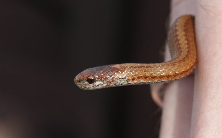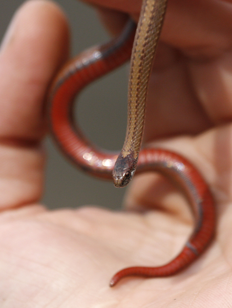 Below: A Northern Red-bellied Snake (Storeria o. occipitomaculata) in Allegany Co., Maryland (4/19/2008). According to Harris (1975), "A spotty statewide distribution. Very common only on the Alleghany Plateau. A brown and a gray phase are known in Maryland. The gray phase predominating populations on the Alleghany Plateau and occassional melanistic individuals are also not uncommon."