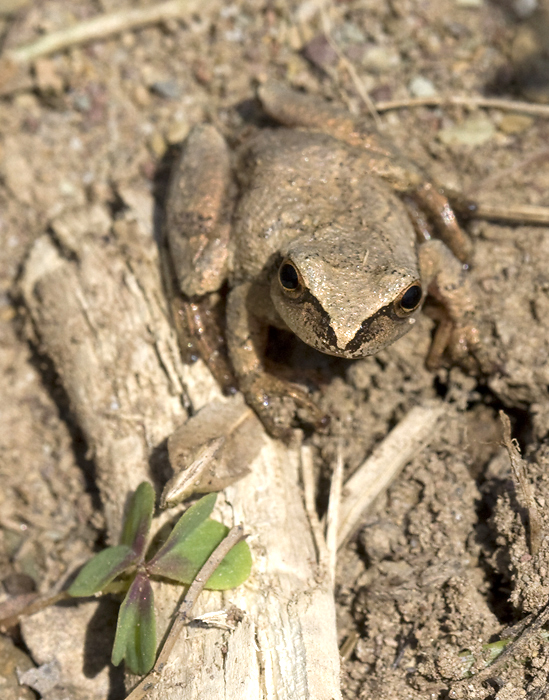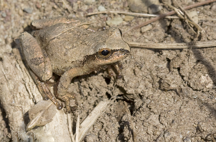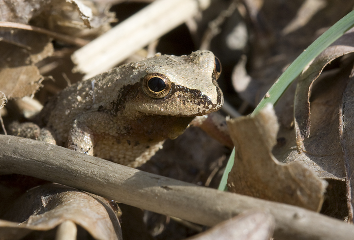 Below three: This Spring Peeper convinced me that it was a Wood Frog due to unusual paleness, lack of red coloration, and lack of the diagnostic "X" on its back (it is there, just very faintly). Structure should have been the bigger clue, including overall shape and lack of dorsolateral ridges (as on leopard frogs). It's not the first time I've been tricked by an unusual Spring Peeper! Kudos to Ron Gutberlet and David Yeany for the good catch. Photographed in Green Ridge SF, Allegany Co., Maryland (4/19/2008).
