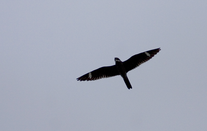 Below: A Common Nighthawk hunts over the serpentine barrens at Soldier's Delight NEA, Baltimore Co., Maryland (5/23/2008). The strong white throat coloration means this bird is a male. He was also doing the cool booming call while performing courtship displays to a female.