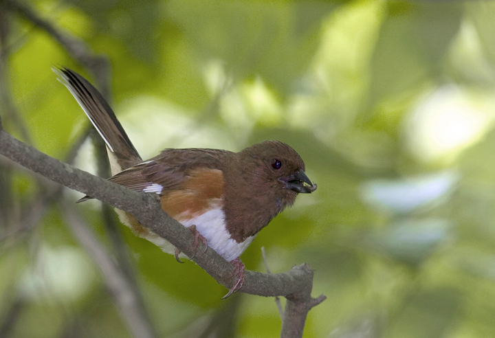 Below: A female Eastern Towhee prepares to feast upon a pillbug she's found while foraging on the forest floor (Carroll Co., Maryland, 5/23/2008).