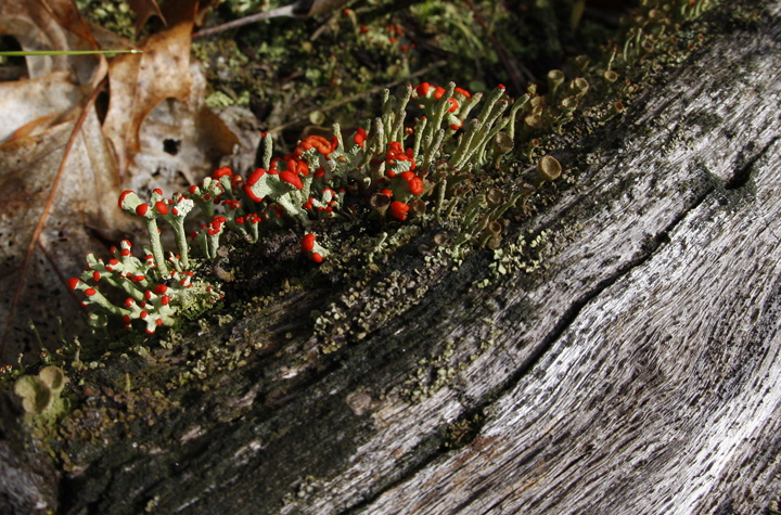 Below: My favorite lichen, British Soldiers (Cladonia cristatella), in Garrett State Forest, Maryland (6/14/2008). I love that lichens have a single scientific name despite being composed of at least two species, a fungus and an alga or bacterium.