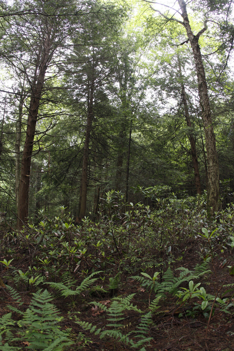 Below: More beautiful habitat in western Garrett County. This area, composed in large part of Eastern Hemlock, Rhododendron and ferns, hosted nesting Golden-crowned Kinglet, Blue-headed Vireo, and Black-throated Green and Black-throated Blue Warblers (6/14/2008).