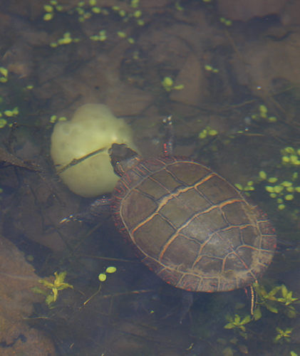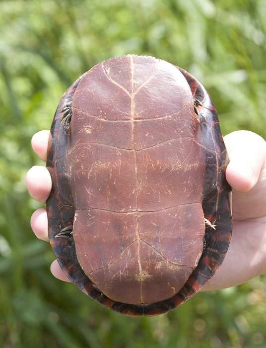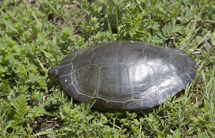 Below two: The Painted Turtles in Garrett Co. are of the Midland subspecies (Chrysemys picta marginata). Unlike Maryland's more widespread Eastern Painted (C. p. picta), the scutes on the carapace (plates on the upper shell) are staggered rather than even with one another across its shell. The plastron (underside) is variable, often showing dark splotches but sometimes all dark as in this individual.