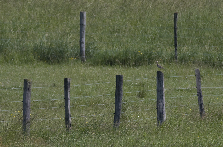 Below: A sight that we all wish were much more common--a nesting Upland Sandpiper keeping watch on his meadow domain from a fence post (Garrett Co., Maryland, 6/15/2008).
