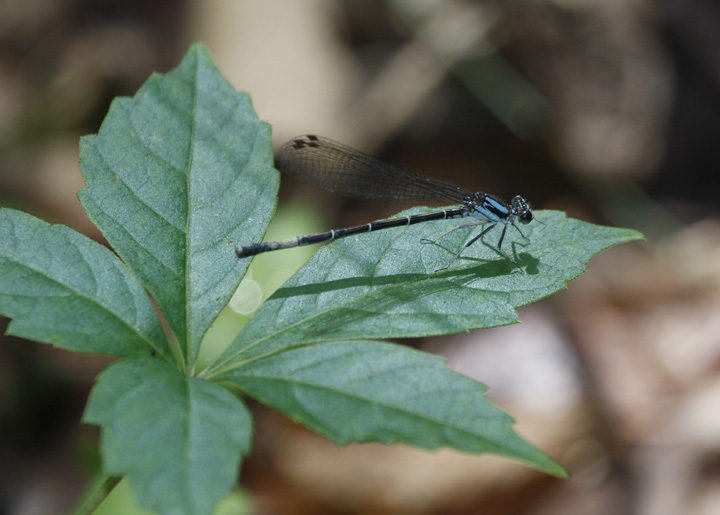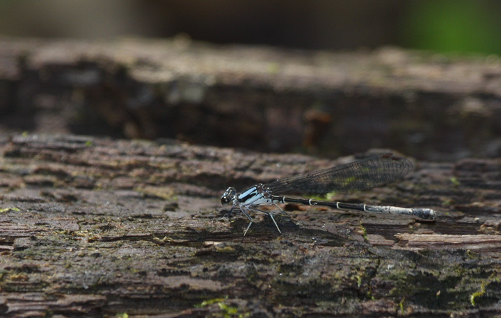 Below: Apparently a blue-form female Blue-tipped Dancer in Anne Arundel Co., Maryland (6/29/2008). The blue marking in the black shoulder stripe is slightly odd-shaped and there is discoloration at the end of the abdomen. The latter might be explained by the female ovipositing eggs in muddy water.