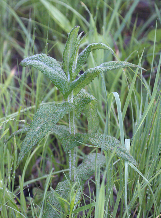Below: Boneset (Eupatorium perfoliatum), a native plant growing in Garrett Co., Maryland. The uniquely joined leaves led to the belief that it could assist with mending broken bones. It was also historically used to break a fever via heavy sweating. (Backbone Mountain, 6/15/2008)