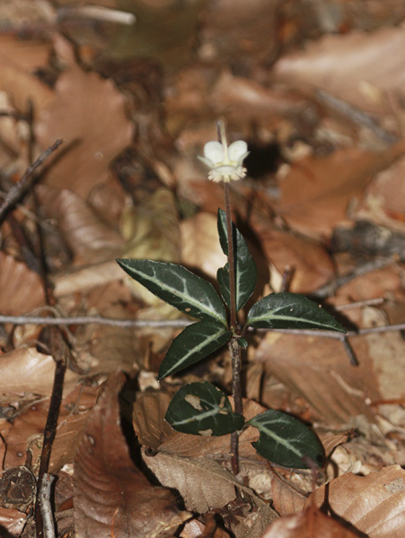 Below: A native herb, Spotted Wintergreen, peaks through the leaf litter in a Talbot Co. woods (6/29/2008).