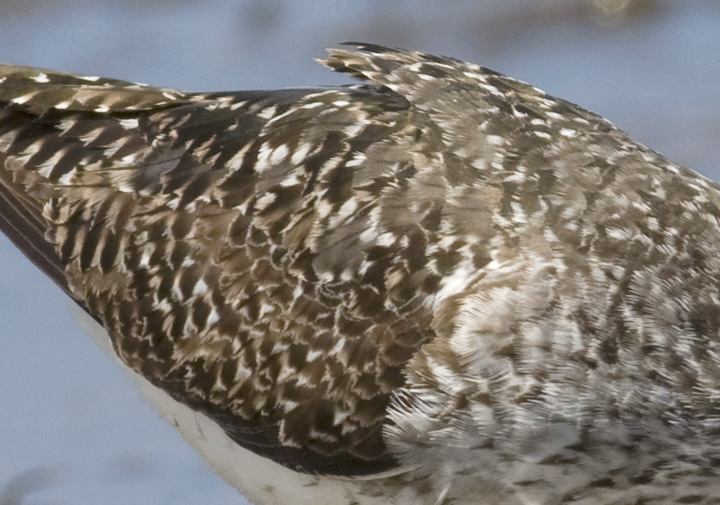 Above and below: This is an adult bird molting into nonbreeding plumage. Note the fresh gray feathers coming in amongst the brown and black feathers. This complete molt begins on the breeding grounds in July, but is suspended during fall migration and completed on the wintering grounds (O'Brien et al., 2006).