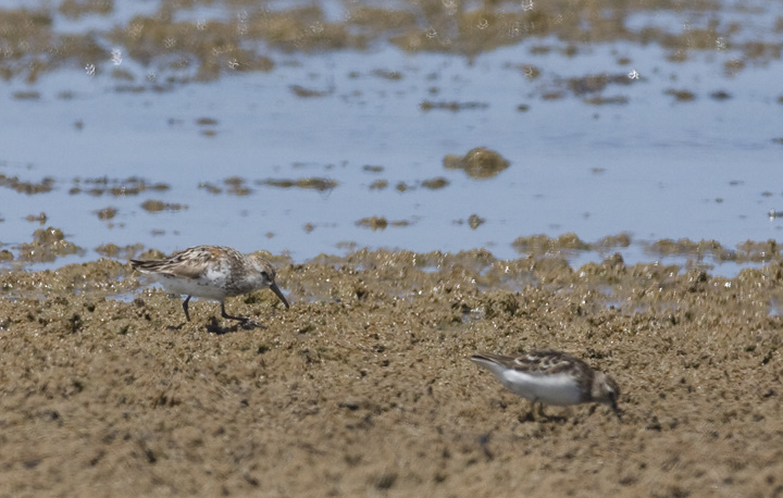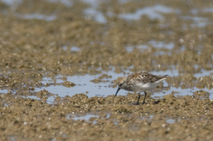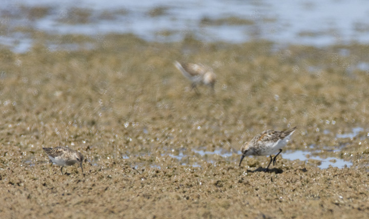Below three: Photos of a molting adult Western Sandpiper through the heat shimmer on a mud flat at Rumbly Point. Note the longer bill, larger size, and plumage differences compared to the nearby Least Sandpiper (7/20/2008). The heat shimmer in these photos really helps portray the miserable humidity of this outing. Just add cruel biting flies and the experience would be complete.