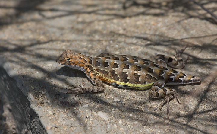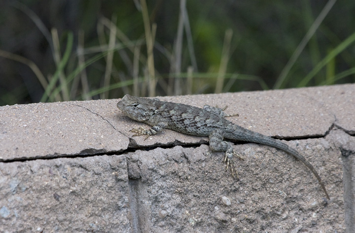 Below: An Elegant Earless Lizard rests beside a bridge in southern Arizona (8/3/2008). The tail shape can be attributed to the lizard losing its tail and slowly regrowing it.