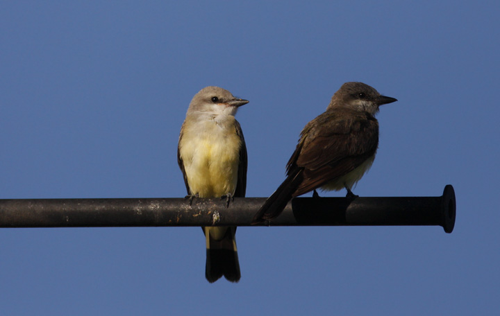 Below: An adult Western Kingbird (left) with a youngster born this summer (in shadow). We were struck by how much the young birds could resemble Cassin's Kingbirds, especially in poor light (Nogales, 8/4/2008).