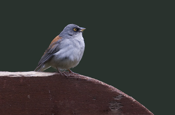 Below: This enthusiastic Yellow-eyed Junco was singing boldly from the Rustler Park welcome sign. Every few songs he would fly off and grab a food offering to hold hopefully.