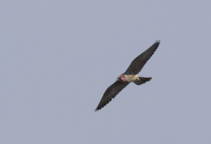 Below: We spotted this interesting Peregrine Falcon on Assateague Island, Worcester Co., Maryland (10/5/2008). It appears that its head was dyed by banders for identification purposes.