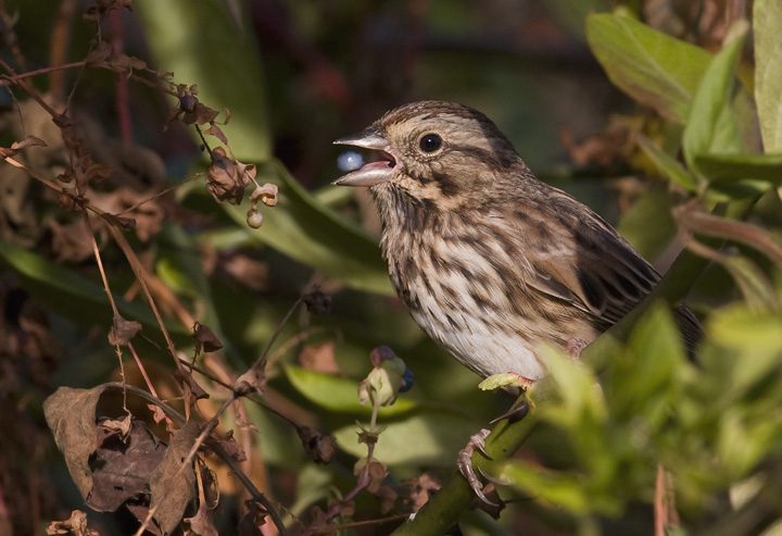 Below: A Song Sparrow snacks on Mile-a-Minute berries at Kinder Farm Park, Anne Arundel Co., Maryland (10/14/2008).