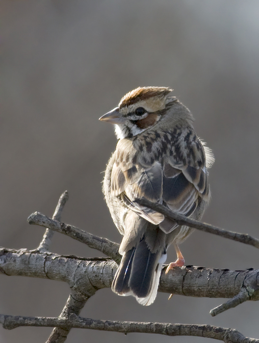 Below: A Lark Sparrow continues its winter stay in Somerset Co., Maryland (12/5/2008). During this visit, the bird was actually doing a bit of singing.