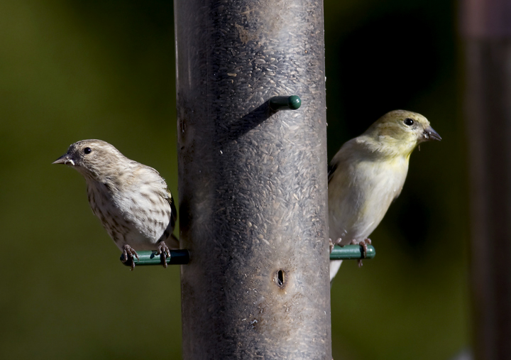 Below: A Pine Siskin feeds side-by-side with an American Goldfinch (Pasadena, MD, 12/25/2008).