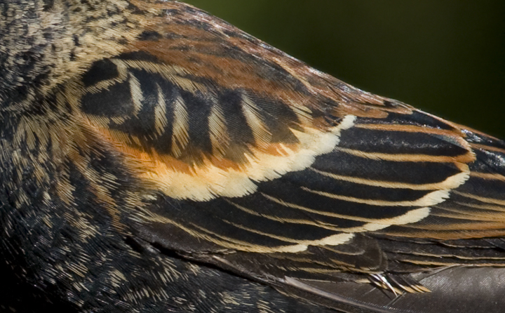 Below: Feather details on a Red-winged Blackbird (Pasadena, Maryland, 12/25/2008).