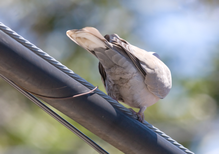 Although there are many subtle field marks worth noting, the most reliable test is the pattern of the tail and undertail coverts (and voice). Only the fourth image (directly above) is a Eurasian Collared-Dove. In the image with two birds, both are actually African Collared-Doves. Below, note the white undertail coverts in the African Collared-Dove (first image) and then the gray undertail coverts of the Eurasian Collared-Dove (second image). The Eurasian Collared-Dove has a wider, more square tail that shows dark outer webs. The primaries of a Eurasian Collared-Dove are much darker, but I found that lighting conditions often made this difficult to judge (see below two, for example). A combination of field marks is the way to go. It was very cool getting to study so many African Collared-Doves. My only Eurasian Collared-Doves were between the towns of Combate and Pole Ojea.