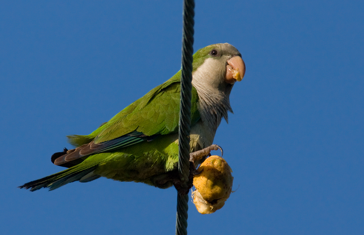 Above: The Puerto Rican subspecies of Lesser Antillean Pewee (Puerto Rican Pewee) in Bosque Estatal de Maricao, Puerto Rico (4/11/2009). Below: A Monk Parakeet enjoys a piece of fruit on a telephone wire outside of Arecibo, Puerto Rico (4/12/2009).
