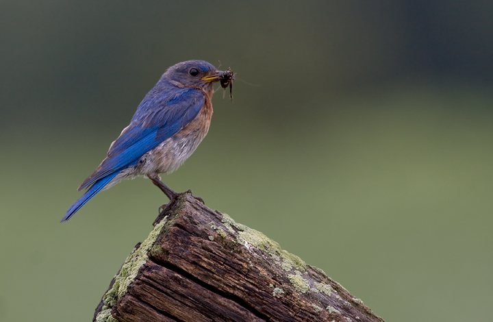 Below: An adult male Eastern Bluebird captures a cricket for a hungry youngster. (Antietam National Battlefield, 7/31/2009)