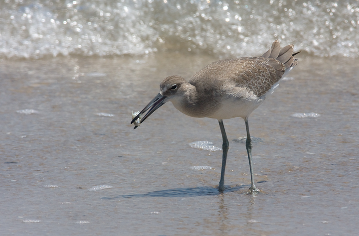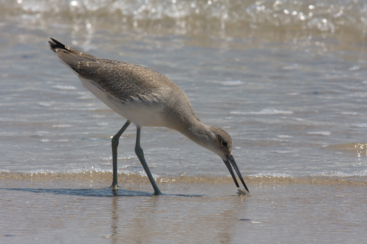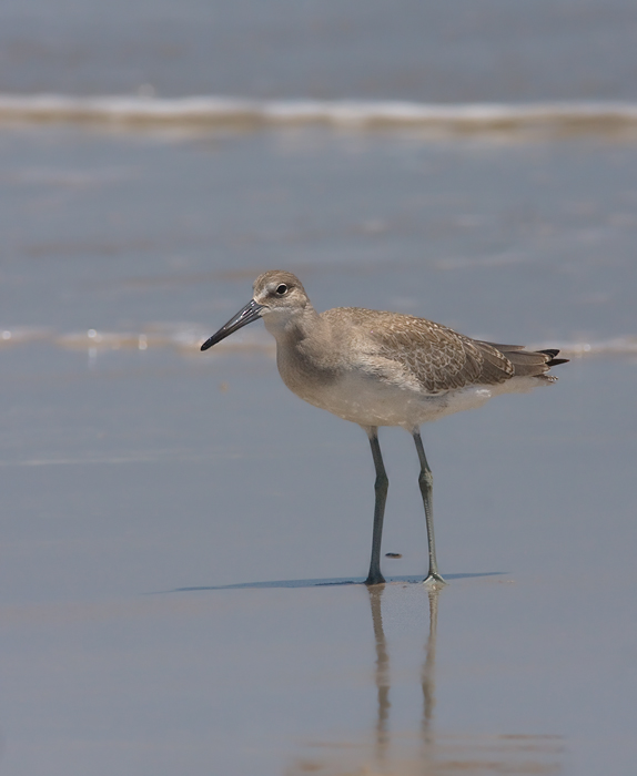 Below: A juvenile Western Willet on Assateague Island, Maryland (8/1/2009). This is my first time identifying this age/plumage in Maryland. The bird has very neat patterning on light buffy/gray upperparts, little contrast between scapulars and coverts, longer and more graceful shape (e.g., not flat-backed), and noticeable primary projection. According to The Shorebird Guide, juvenile Easterns have shorter (from photos almost no) primary projection. The bird was also the same size or even slightly larger than surrounding adult Westerns. Interestingly, the bill on this bird strikes me as much closer to Eastern Willet shape than I've seen on adult Westerns. To be safe, I'll retract my two Eastern Willets reported from Assateague today, as this detail surprised me.