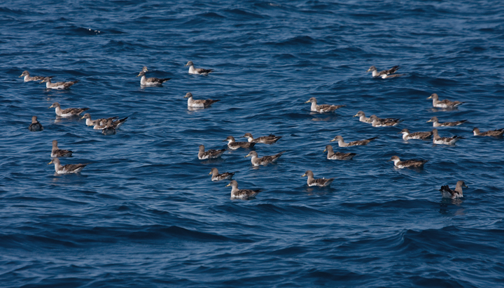 Below: Several of the 300+ Cory's Shearwaters we observed in Maryland waters (8/16/2009). The underwing pattern of the flying individual confirms it is of the expected Atlantic (borealis) population.