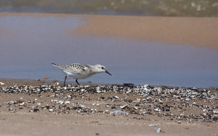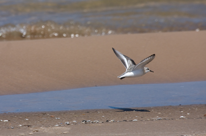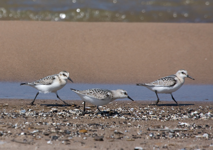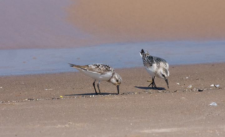 Below: Sanderlings forage along the south shore of Lake Michigan, Marquette Park, Indiana (9/4/2009). All but one individual shown is a juvenile born this summer. It's easy to pick out the one adult molting into basic plumage.