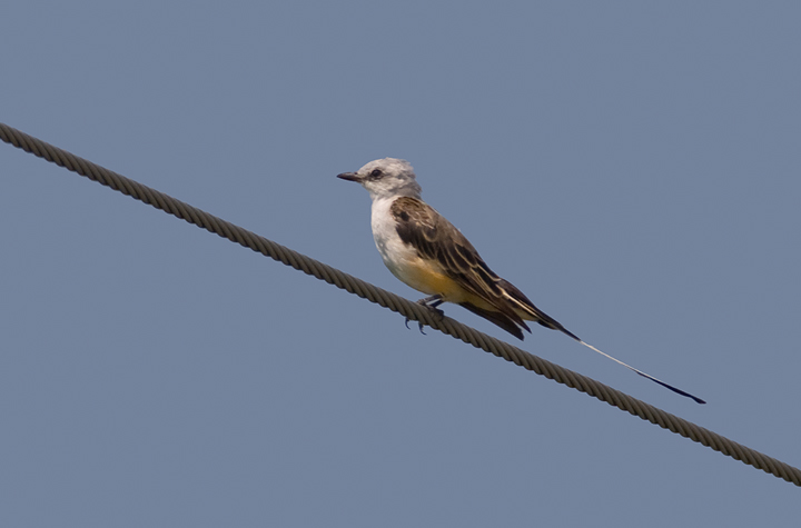 Below: A Scissor-tailed Flycatcher in Queen Anne's Co., Maryland (8/23/2009). Found by Jan Reese just north of Sudlersville, Maryland on 8/22/2009. The flight photo clearly shows the extent of primary molt. The bird also lost its single tail streamer over the next couple days.