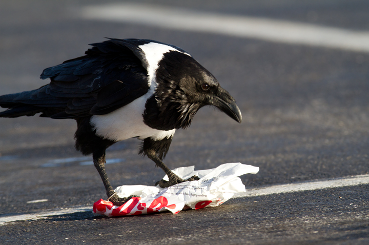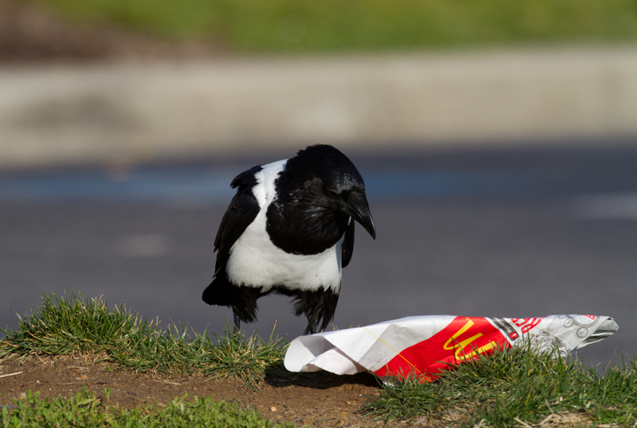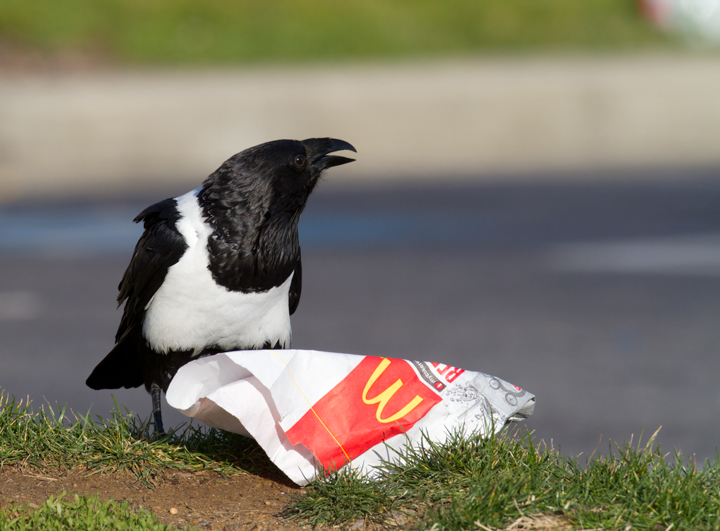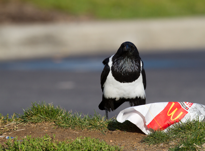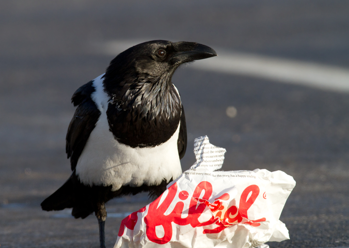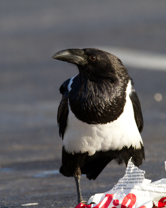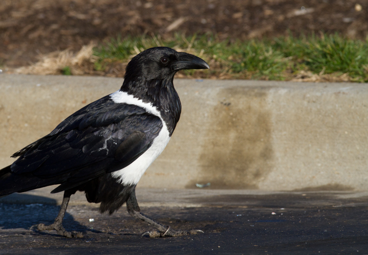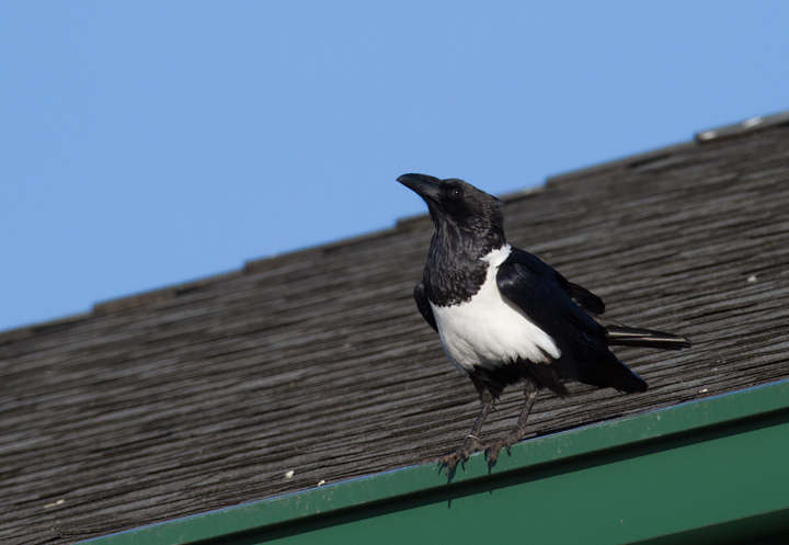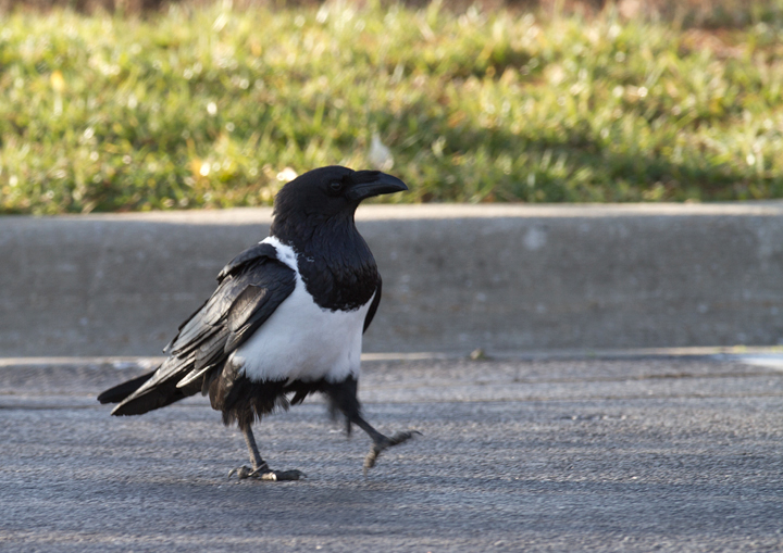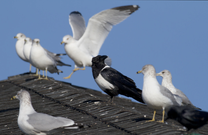 Below: This Pied Crow (Corvus albus) has been observed intermittently in southeastern Baltimore since at least March 2006. It is actually a raven (note the huge bill) and the species is widespread in Sub-Saharan Africa. My theory for its origins are that it must have been intended as a Baltimore Ravens mascot, but either escaped or was released. The area it seems to favor is only about six miles from the Ravens stadium, and of course non-native ravens are essentially the only legal option for mascots. The same species was used for a popular Windex commercial (YouTube video). When we photographed it (12/25/2011), it was drawn to a small feeding flock of Ring-billed Gulls and Fish Crows, and it seemed to specialize in ripping open large paper bags that probably proved difficult for the other species. Note the band on its right leg, confirming its earlier captivity. Whatever its story, it's an awesome bird.