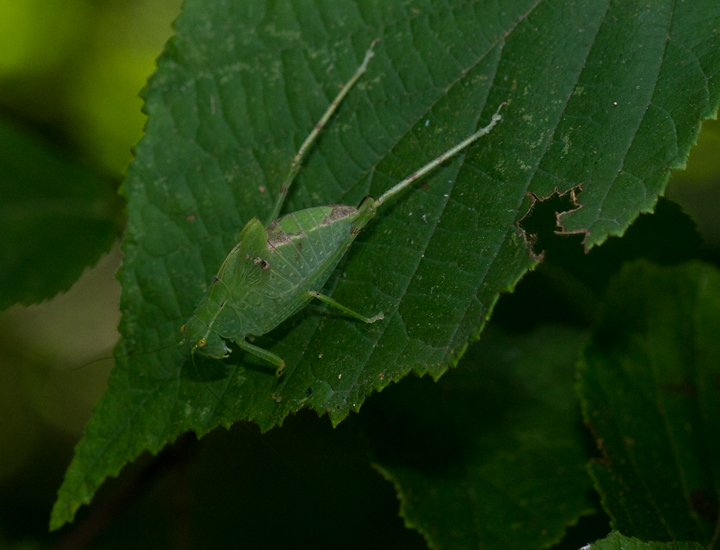Below: A Lesser Anglewing in Prince George's Co., Maryland (8/5/2012). This species has what many of us consider the most familiar "katy-did" call. Separated from Greater Anglewing in this case by the squarely truncate front pronotal margin. A tooth on the front pronotal margin would indicate Greater Anglewing.