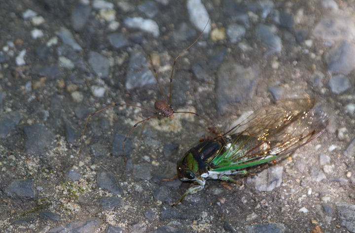 Below: A Swamp Cicada at Downs Park, Anne Arundel Co., Maryland (8/31/2012). This individual is under siege by a Daddy Longlegs and several ants. Field marks include bright green in the wings, the white ventral area, greenish legs, and green patches on the head.