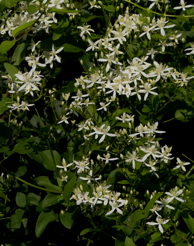 Below: Sweet Autumn Virginsbower blooming along a wooded edge near Fort Smallwood, Anne Arundel Co., Maryland (8/30/2012). Native to Asia, this species forms dense curtains over other vegetation, especially along roadside edges. It is especially conspicuous in late summer when it is blooming. At least it's fragrant.
