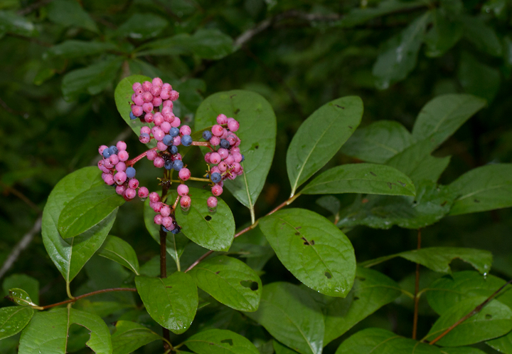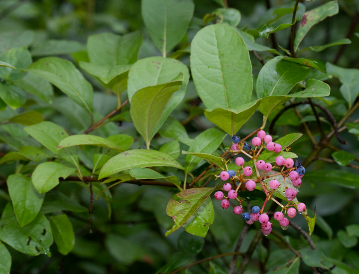 Below: Possumhaw (Viburnum nudum) with distinctive colorful berries on a wooded swamp edge in Dorchester Co., Maryland (9/2/2012).