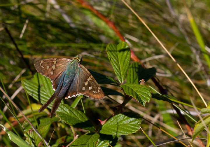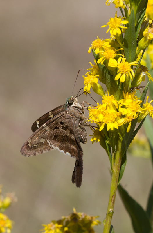 Below: A beautiful, much hoped-for vagrant Long-tailed Skipper on Assateague Island, Maryland (10/13/2012). This species is a rare, late season wanderer from the South. A great spot by Jim Brighton.