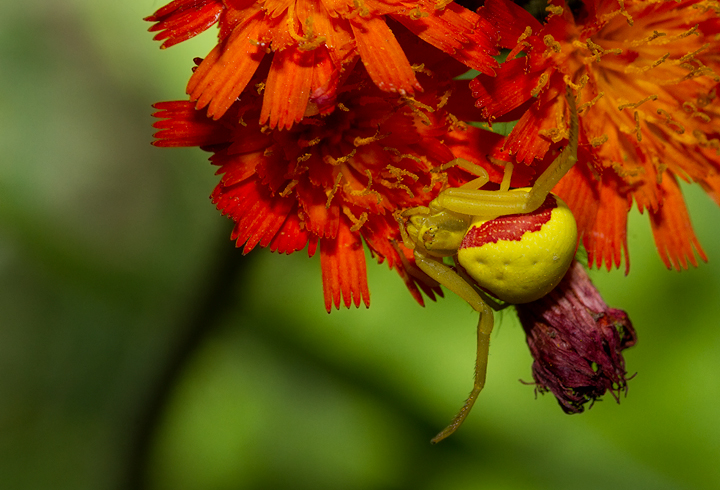 Below: A Goldenrod Crab Spider (Misumena vatia) on Orange Hawkweed at Baxter State Park, Maine (7/9/2013). Thanks to Joe Lapp for verifying the identification.